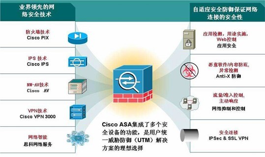 当前,校园网的安全形势非常严峻,大量的垃圾邮件、黑客攻击、病毒蠕虫等困扰着管理者。而且这些作乱工具越来越先进,只要略懂技术的人都可以掌握这些工具,对校园网造成危害。尤其在Internet 出口,有大量的病毒和垃圾邮件困扰着校园网管理者。因此我们在Internet出口配置Cisco ASA 5500自适应安全设备。它集成了Cisco PIX 500系列安全设备、Cisco IPS 4200系列入侵防范系统和Cisco VPN 3000系列集中器的最新技术,提供了无与伦比的安全解决方案,阻挡最广泛的网络威胁。作为思科自适应威胁防御和统一安全访问战略的关键组件,Cisco ASA 5500系列能够将安全广度与VPN技术结合在一起,提供丰富的应用安全性、Anti-X防御、网络遏制和控制以及“清洁VPN”连接,是用户统一威胁防御(UTM)解决方案的理想选择。